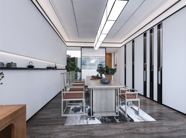 大面積落地玻璃將自然光引入室內(nèi),使得室內(nèi)寬敞明亮,使用局部燈光照明,視覺效果上增加了空間的層次感。干練的硬裝彰顯豪邁的氣派,白凈優(yōu)雅的軟裝則體現(xiàn)極簡的中國風(fēng)茶室。