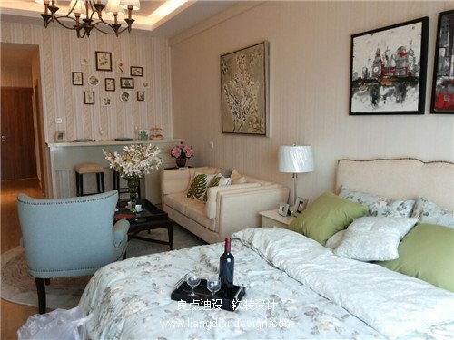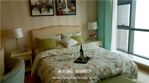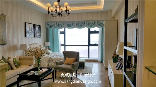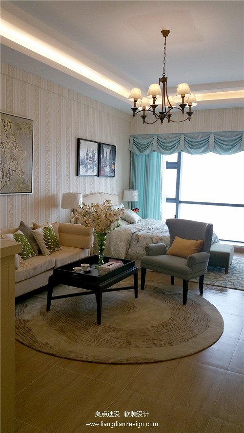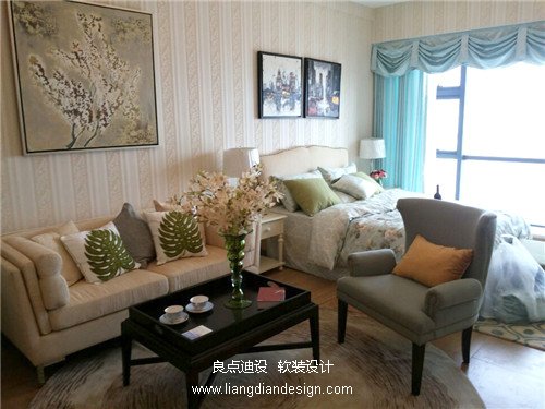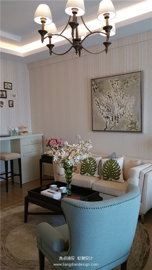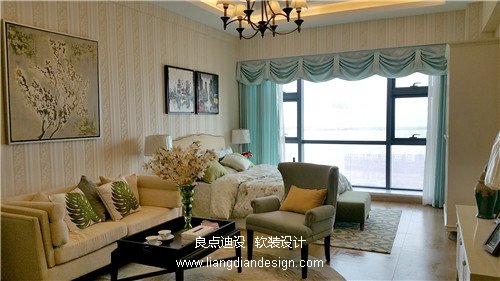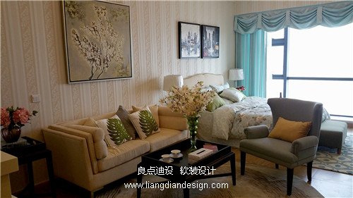 不大的空間功能齊備,看書、會客、休憩,一應俱全。棕、米、灰的配色都令氣質柔和高貴。整體空間頂部運用形態優雅的多頭銅制吊燈點亮空間,客廳搭配柔和舒適的親膚面料包覆的沙發,點綴綠葉靠枕,隨意插入的充滿生機的鮮花帶出浪漫純真,使居者在這里能美好的享受每一天。臥室床品淡雅清新,經典造型床頭柜上擺放簡潔的水晶造型臺燈,并搭配藍綠色落地窗,使空間充滿雅致自然氣息,疏朗的布置令人神清氣爽,互為呼應的顏色、隨意中顯出一絲不茍,綠色元素被一再強調,是為呼喚人們內心歸處。
