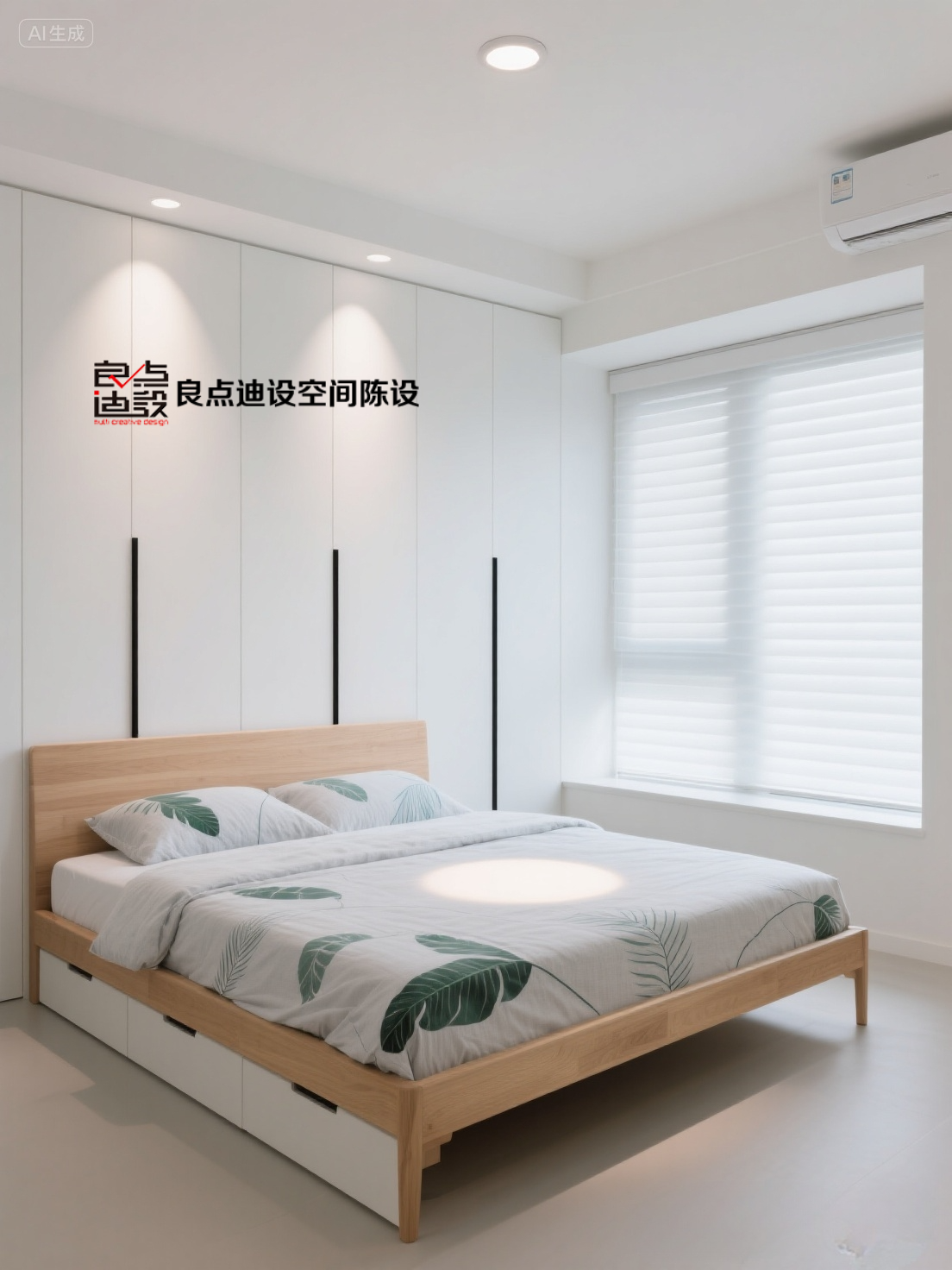 次臥空間不算大,整體采用定制設計,以提高整體空間利用率,依舊是原木+白的配色方案,自然舒適和諧。床頭燈采用向上設計,避免起夜開燈刺眼,