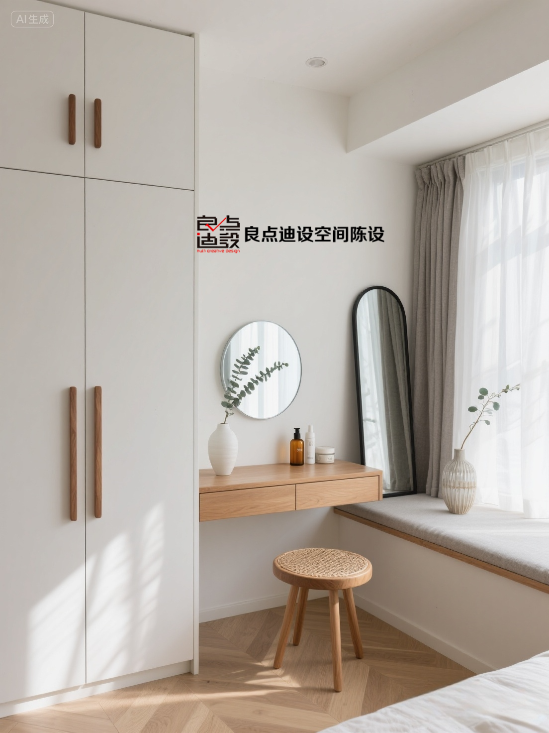 整個餐廳空間以白色和原木色為主,白墻上掛著中式風(fēng)的裝飾品,原木風(fēng)的餐桌椅和長矮柜滿足餐廳的使用和收納需求。