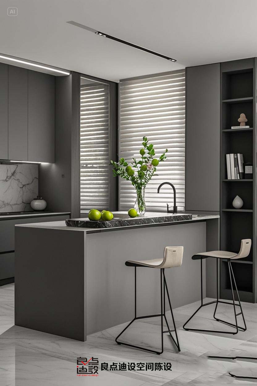 整體色調(diào)以沉穩(wěn)的灰色為主旋律,櫥柜的深灰色調(diào)散發(fā)著低調(diào)的奢華感,與光潔的黑色臺面相互映襯,彰顯出獨特的時尚品味。冰箱與烤箱等大型家電被巧妙地嵌入櫥柜之中,一體化的設計讓整個廚房線條流暢,整潔有序。