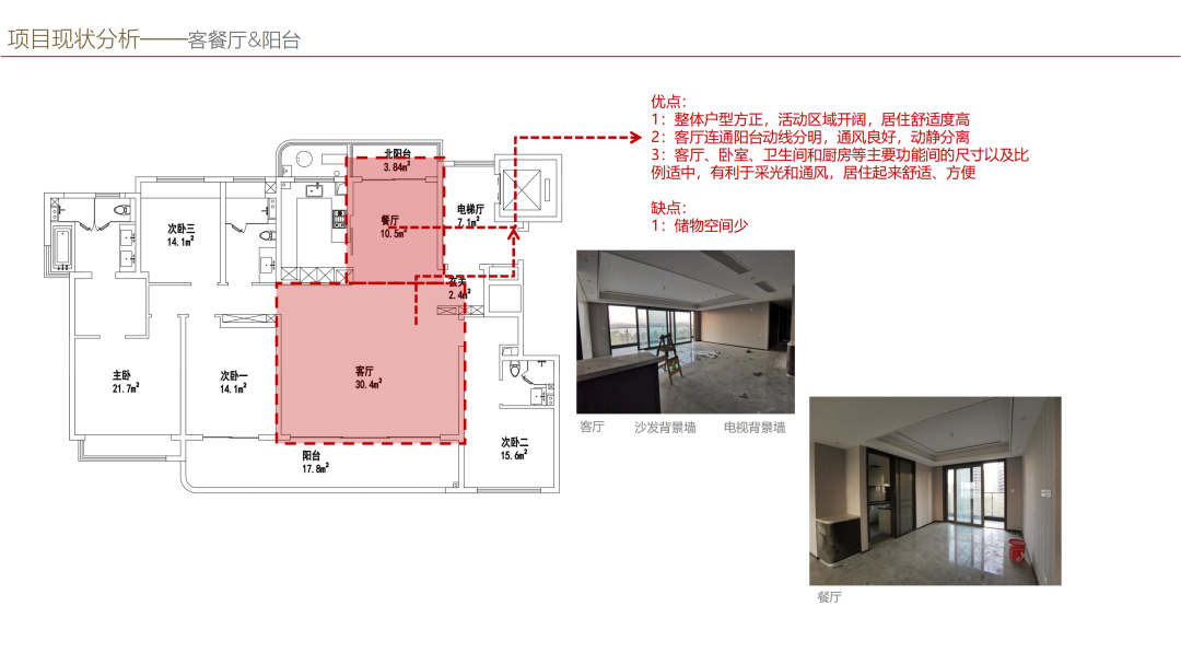 客餐廳以及陽臺是一個將南北連在一起的空間,整個空間還是相對比較方正的,活動區也是比較寬闊,在這個空間里邊舒適度來講也是還不錯的。