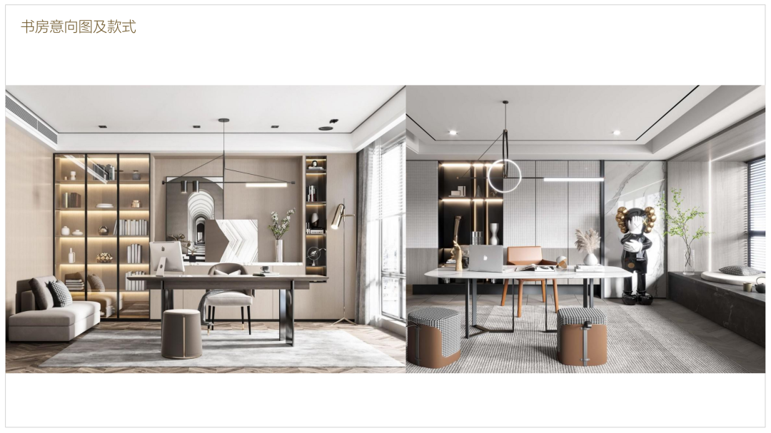 北面的小房間當作獨立 書房使用,形式是多種多樣的,不同的風格有不同的設計手法以及材質的運用都是跟風格息息相關的,需要注意的是頂面跟側面,他跟墻體的一些收口的問題,材料肌理的選擇,也應該跟燈具、窗簾這些軟裝方面的東西整體統一起來去考慮。