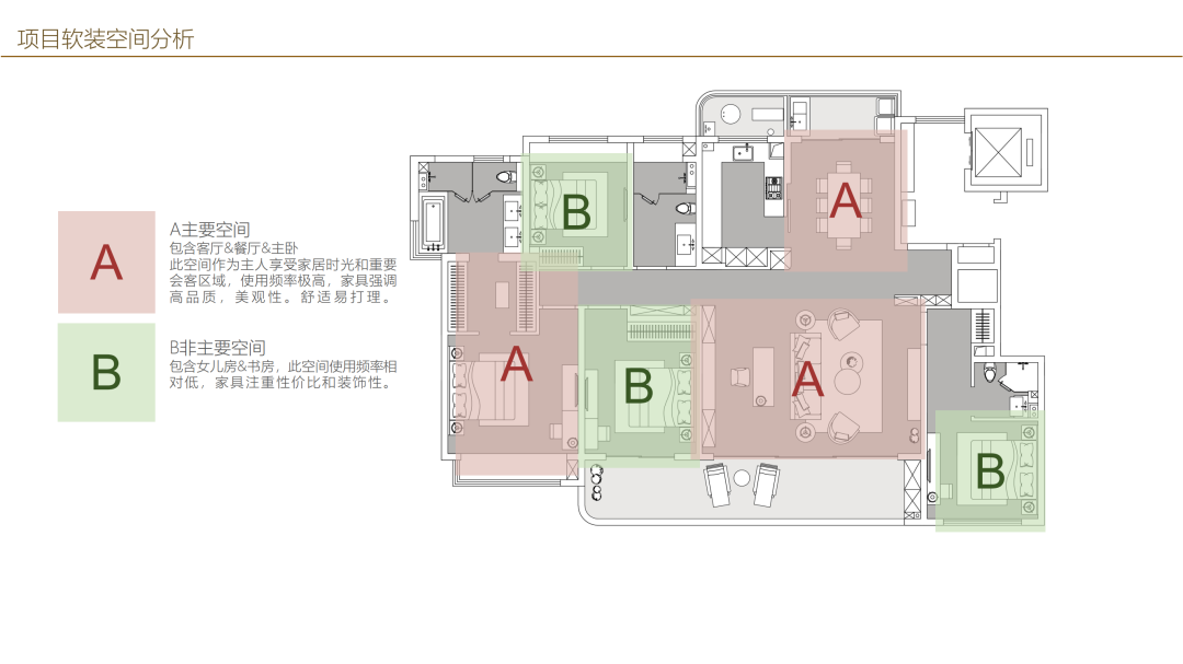 對于整體空間,一定要有主次之分(如上圖),整個空間一定以客餐廳和主臥作為整體空間的 主要空間,使用頻率相對更高,家具更強調品質和美觀,同時具備舒適性,便于打理。