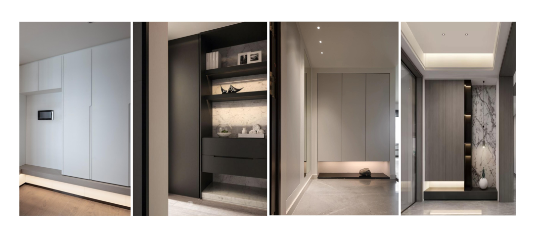 玄關做一個嵌入型玄關柜,順著墻的一邊擺放,如果走廊比較寬的話,可以擺成兩排,增加收納空間,建議I型。