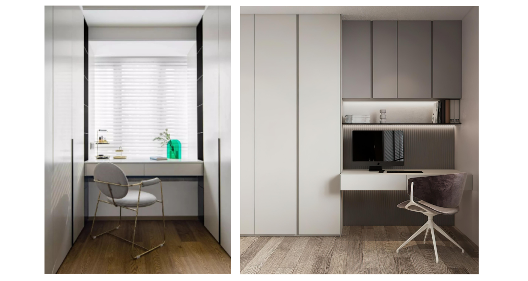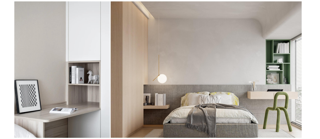 采用了書房與衣帽間一體化的設計,同時滿足收納衣物與書籍的需求。窗邊的書桌引入了自然光,可兼作辦公桌與梳妝臺,頗具匠心。
